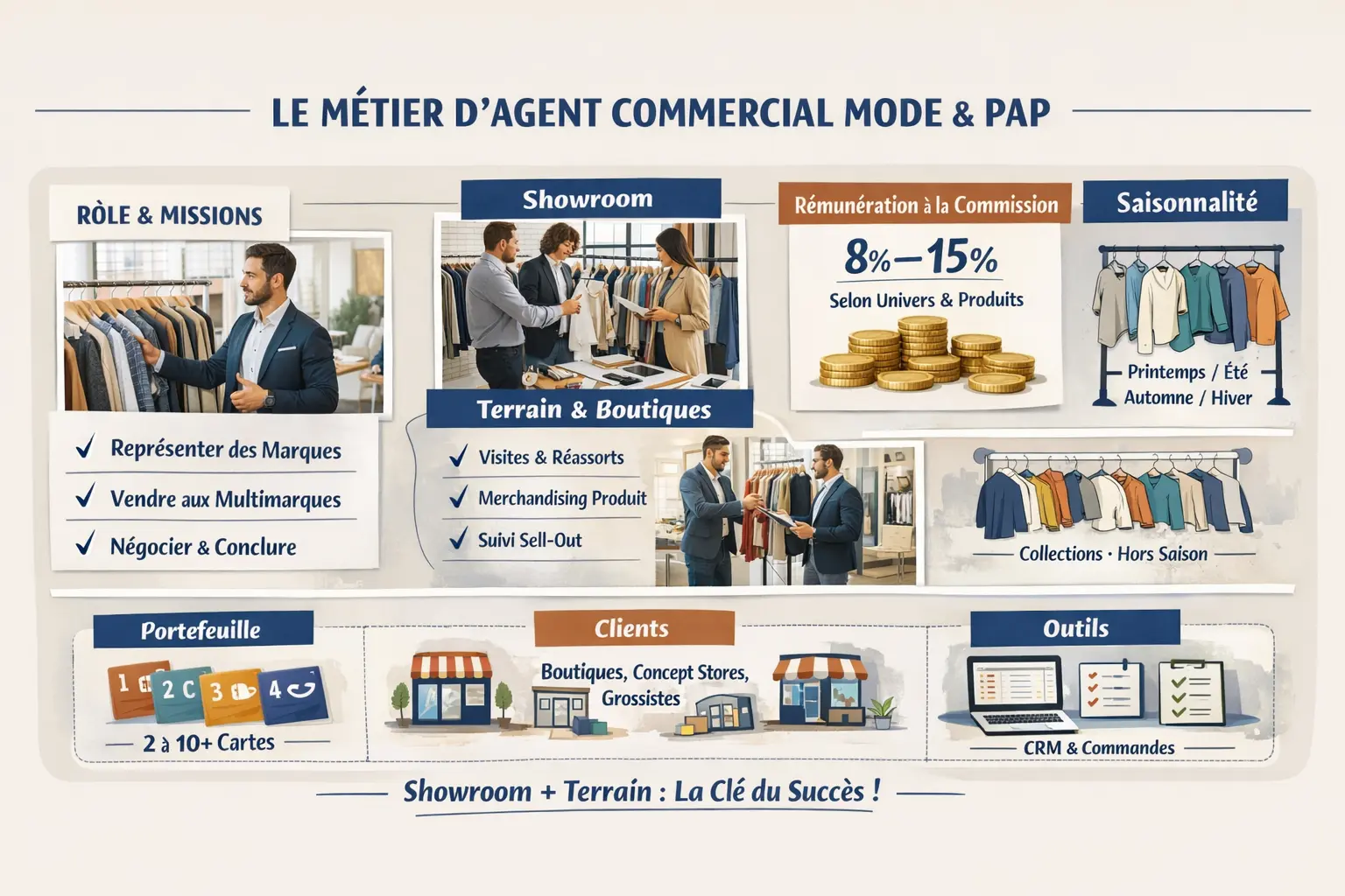 Dans la mode, le showroom est très souvent central pour la prise de commandes saisonnières. Le terrain reste néanmoins indispensable pour sécuriser la rotation, la mise en place et la relation boutique.